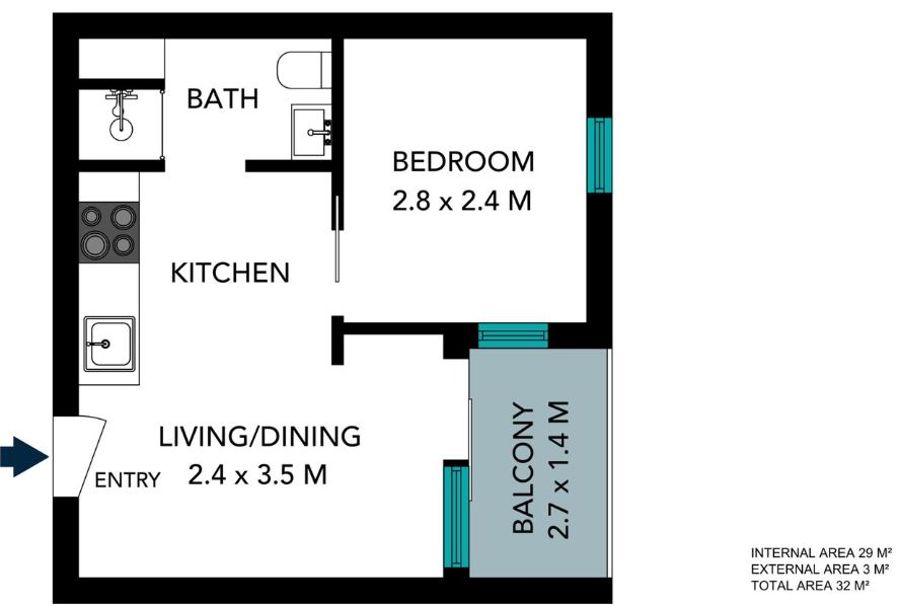 The functional layout feels modern and welcoming and is filled with natural light. The open-plan kitchen and dining area features a four-burner gas cooktop and ample storage space.